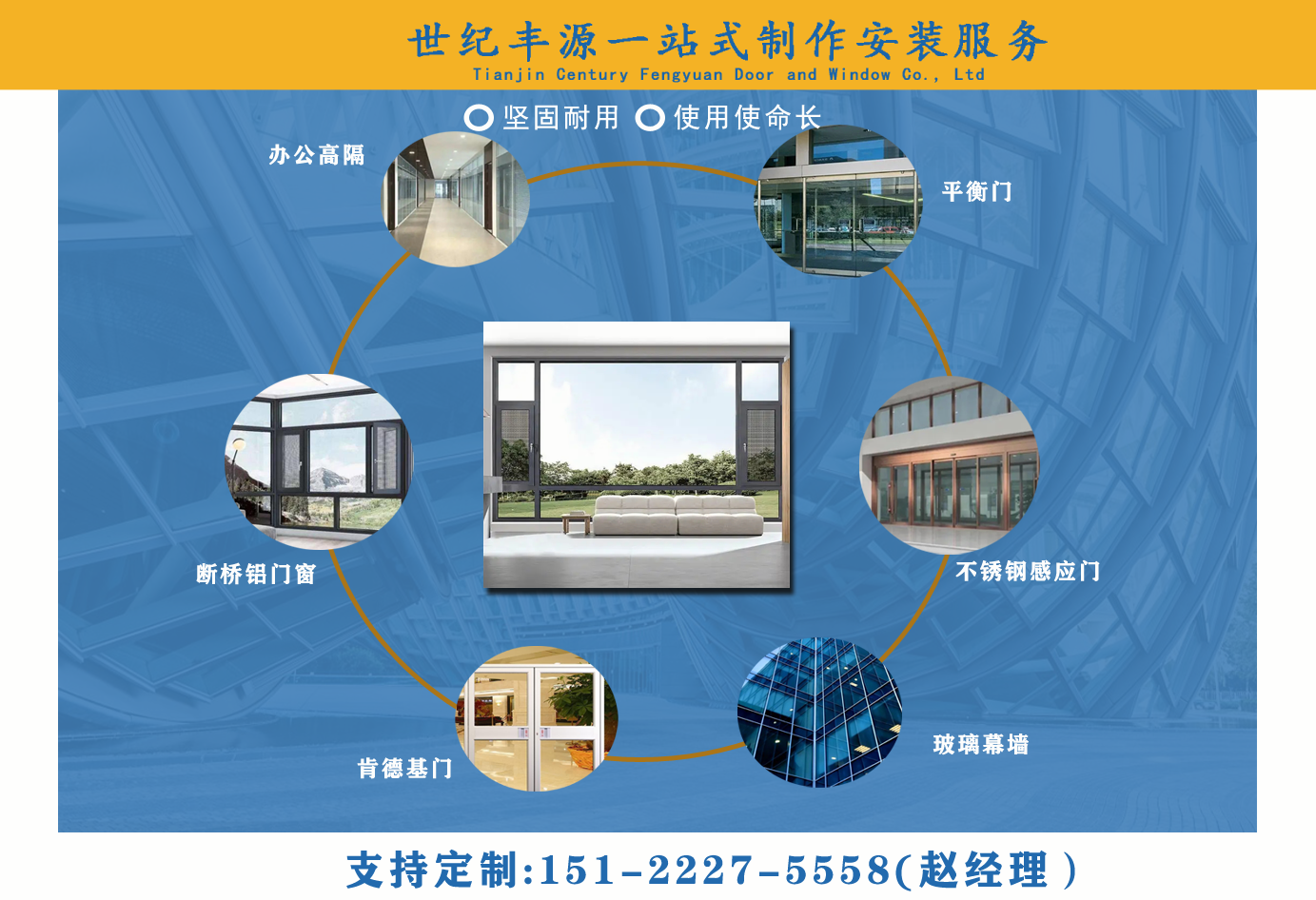 天津世紀豐源門窗有限公司從事斷橋鋁門窗,玻璃幕墻,平衡門,肯德基門,不銹鋼感應門,百葉窗,辦公高隔,制作安裝一站式訂制生產及配套服務等?! 」咀猿闪⒁詠?,始終堅持以人才為本、誠信立業的經營原則,薈萃業界精英,成熟的技術、管理方法及企業經驗與國內企業的具體實際相結合,為企業供給各個方面的解決方案,使企業在激烈的市場競爭中始終堅持競爭力,實現企業快速、穩定地發展。 質量好、服務好、才能信譽好,公司已在諸多領域取得輝煌成績,愿意成為您可信賴的長期合作伙伴?! ∽屛覀償y手同行,共同實現“讓普通老百姓都用得上高端門窗”...